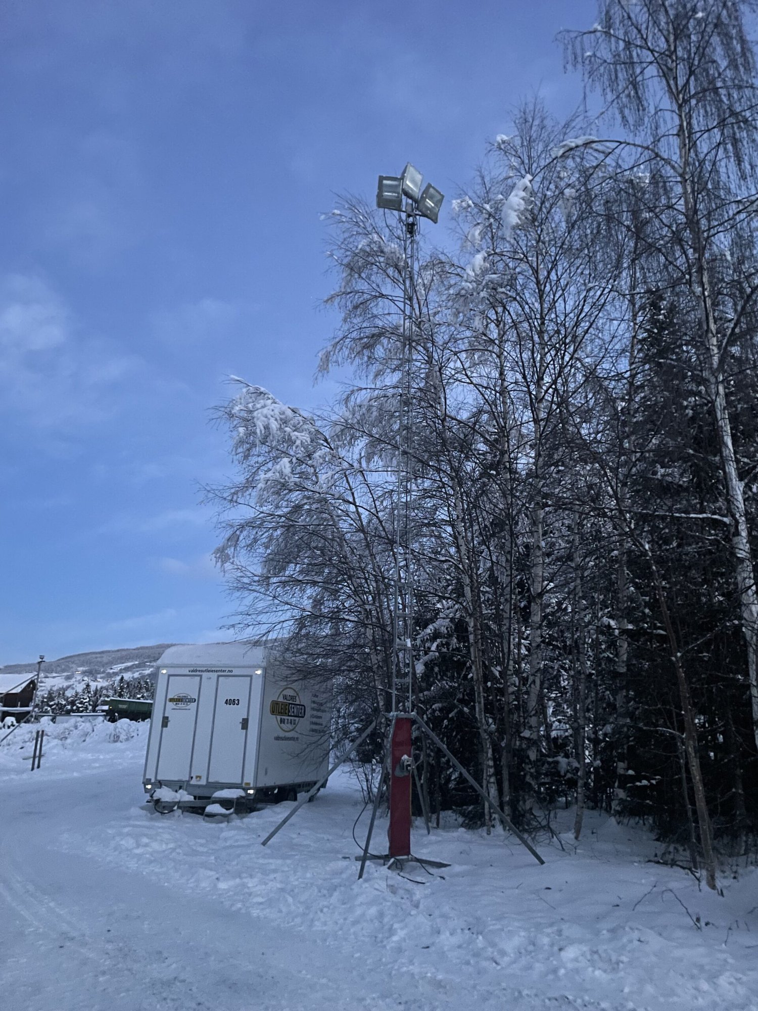 En fin lysmast med 3 lyskastere til byggeplass, kan heises opp til 10 meter høyde.