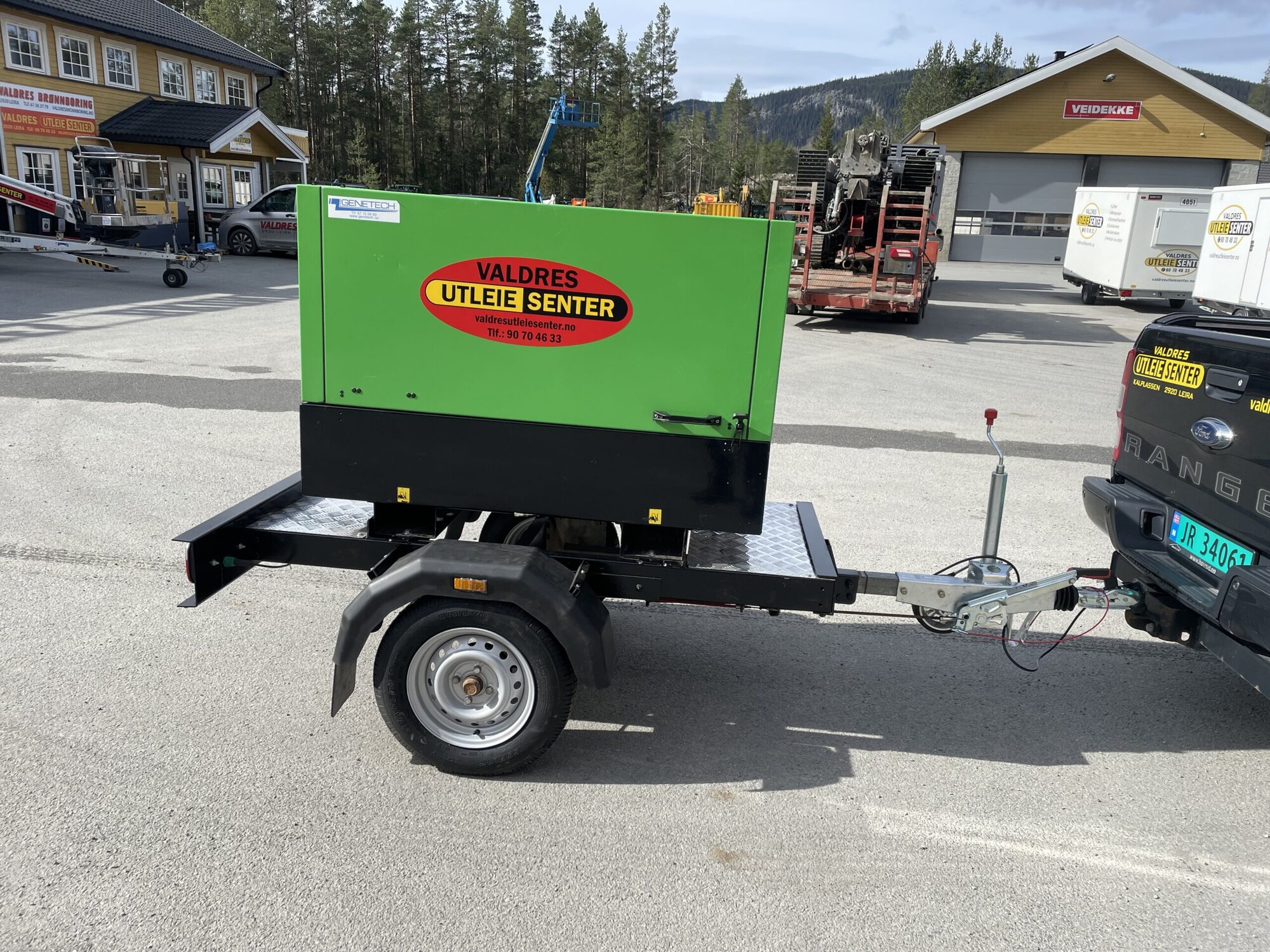Et aggregat på 17kVA, kun 230V med uttak for 3-fas og 1-fas. Hengermontert, så enkelt å ta med seg.